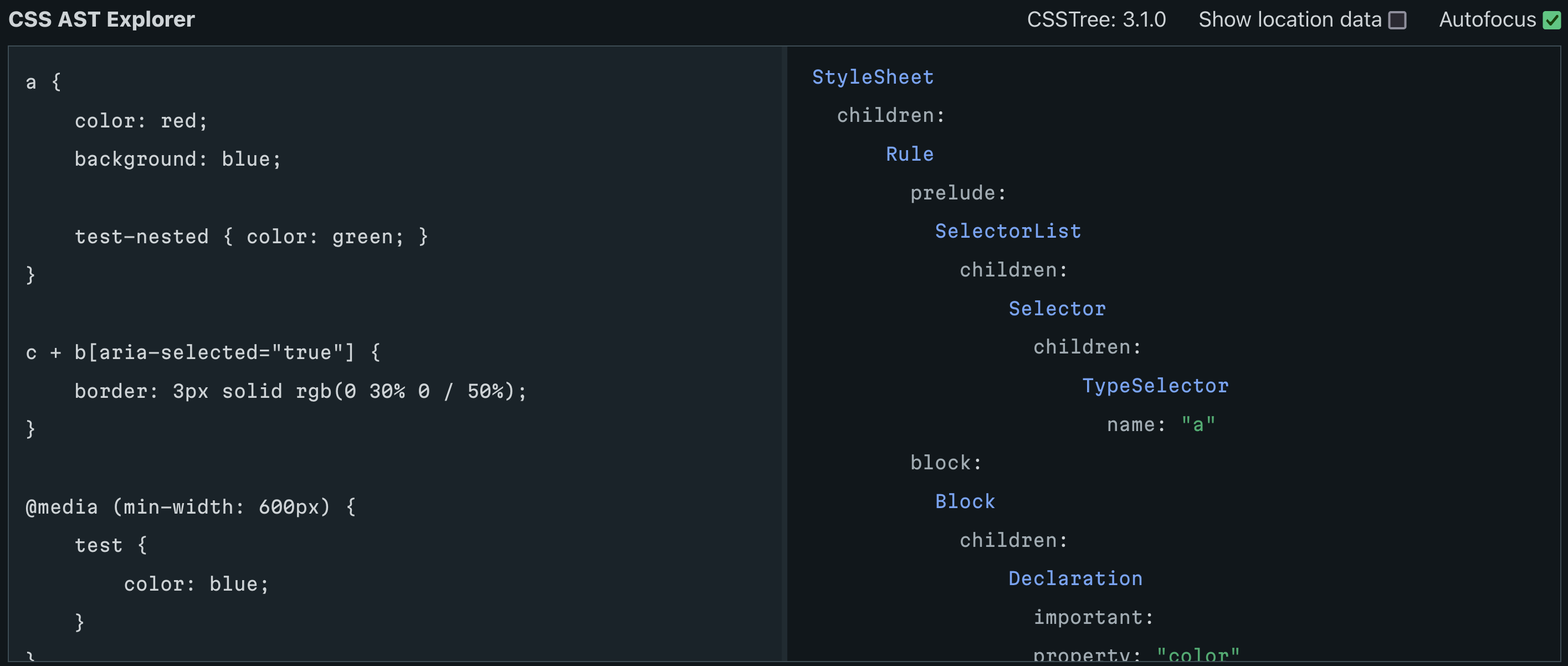 Almost every tool on Project Wallace uses CSSTree under the hood. ASTExplorer.net is a tools that visualizes AST’s like the ones generated by CSSTree. However, ASTExplorer is not running the latest version of CSSTree, so in the interest of learning a new skill and getting a useful tool out of it I created this page as well as opening a PR to update CSSTree at ASTExplorer.